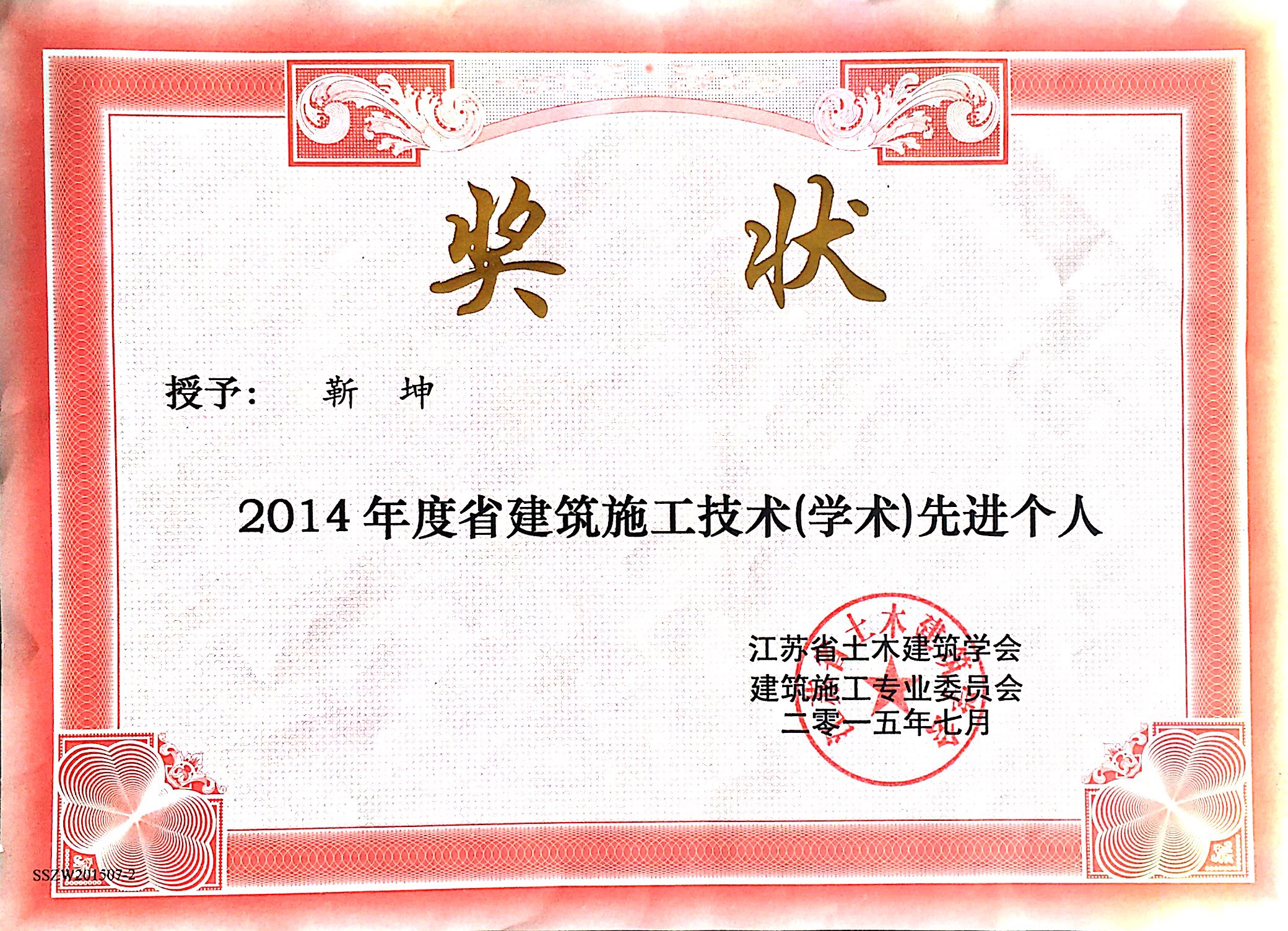 靳坤被授予2014年度省建筑施工技术(学...