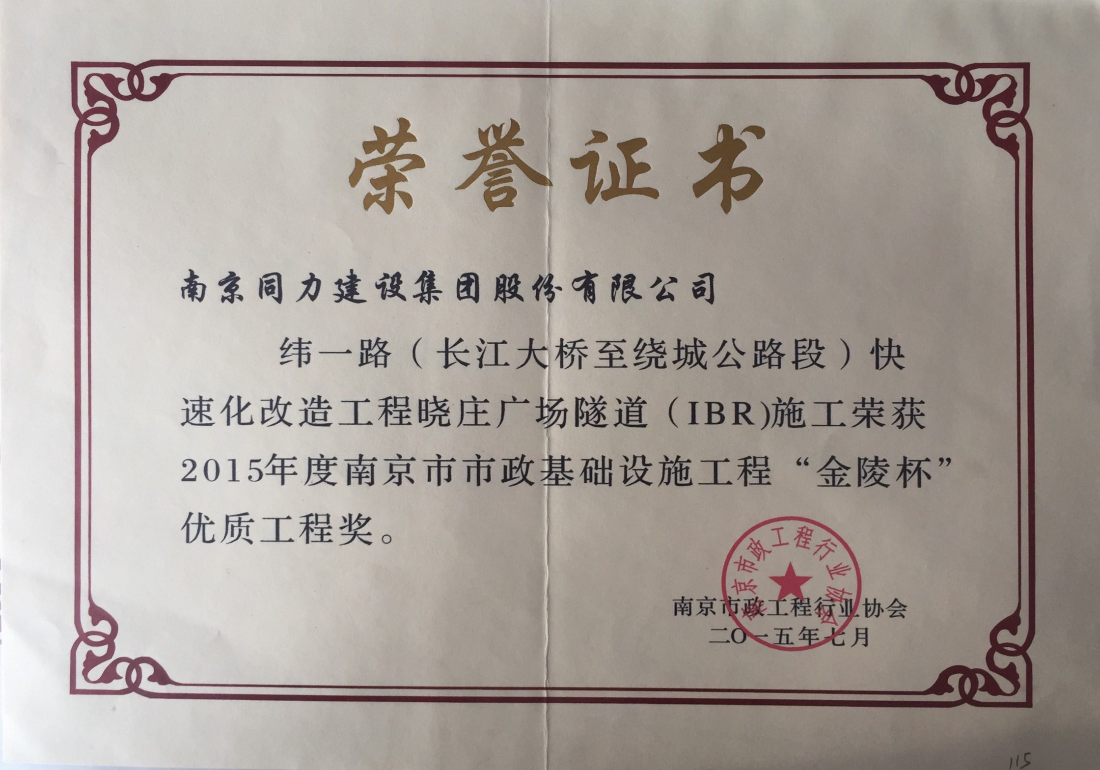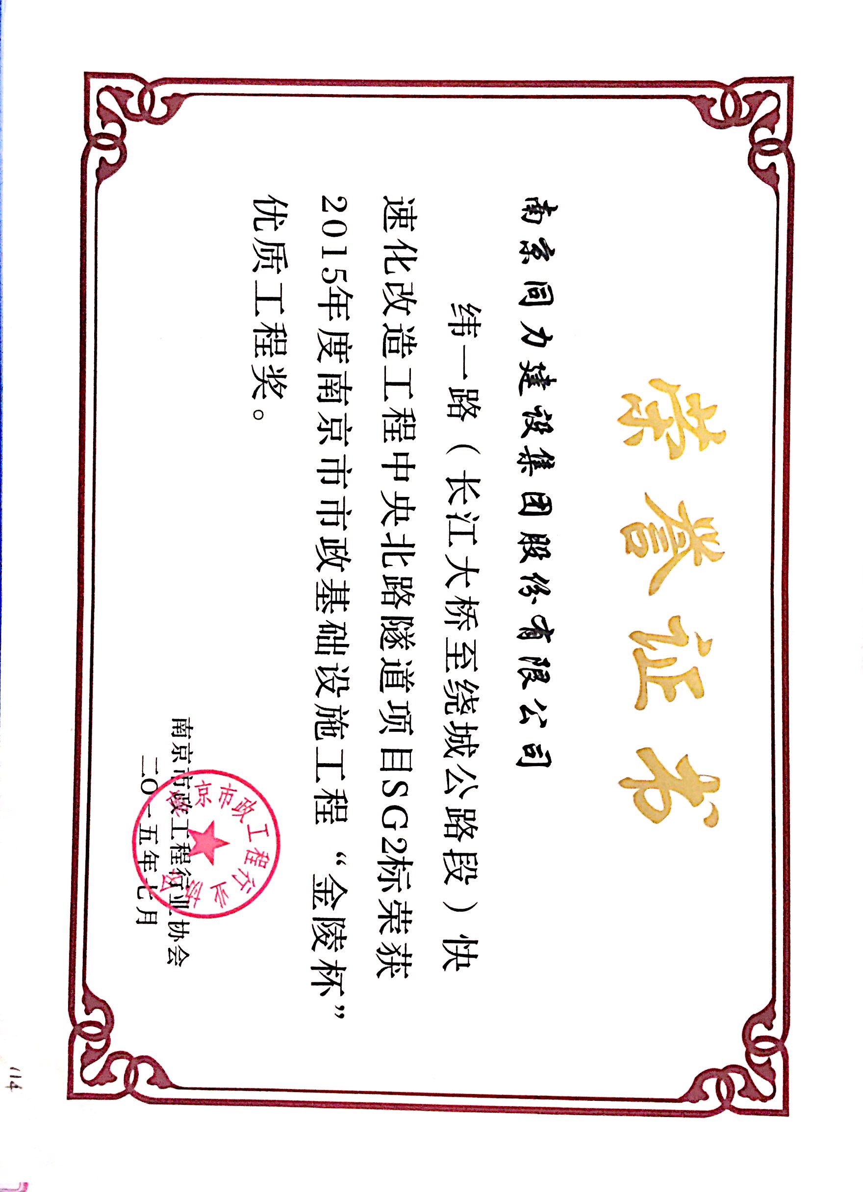 中央北路隧道项目工程获得“金陵杯”优质...