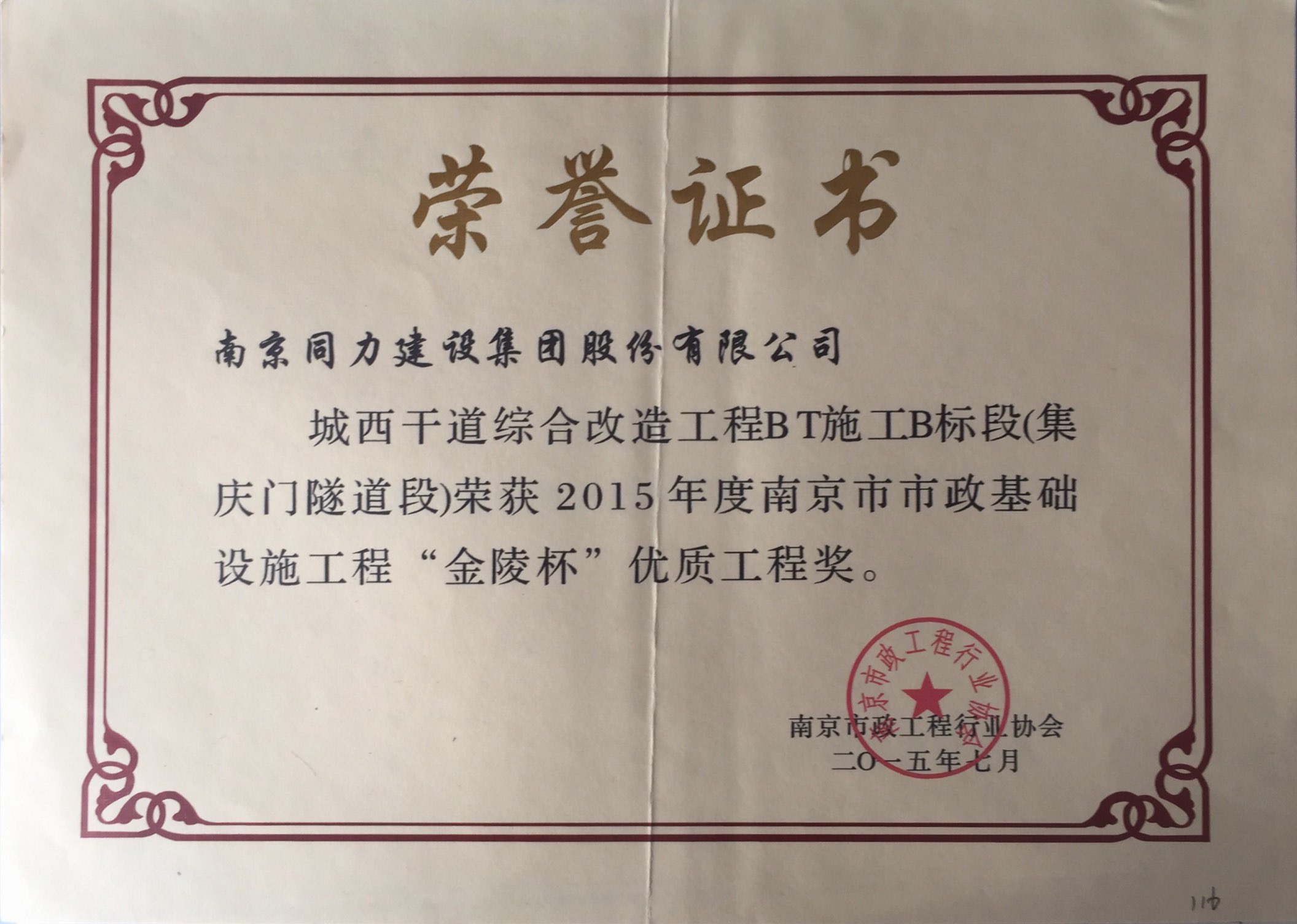 集庆门隧道项目工程获得“金陵杯”优质工...