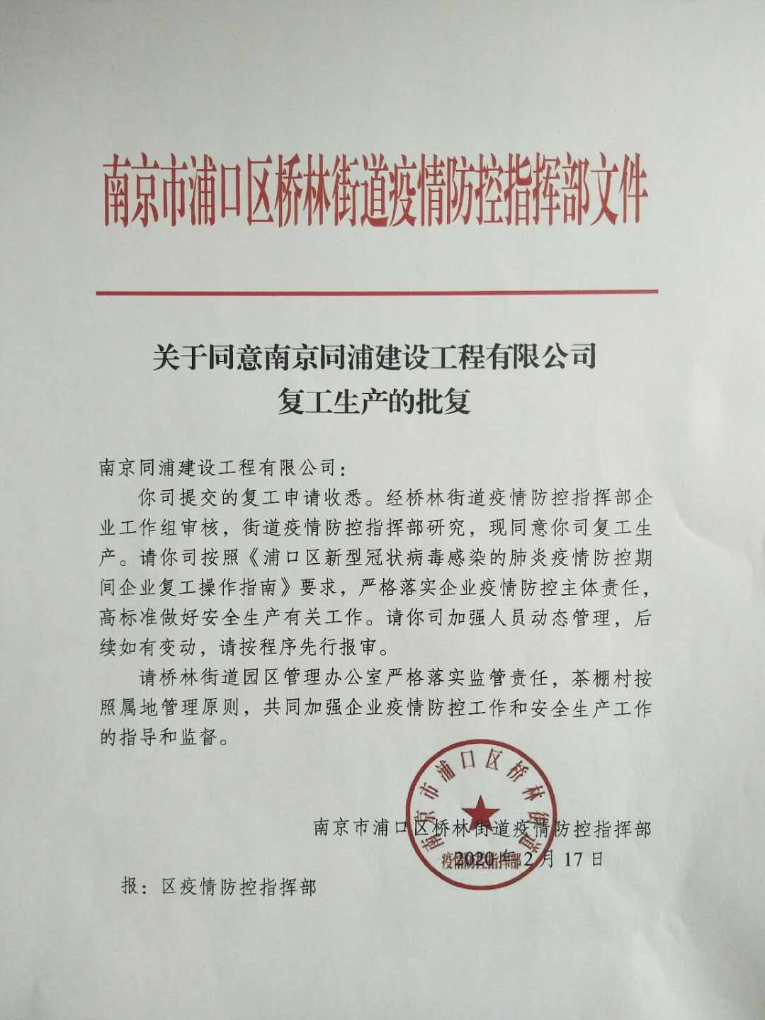 在时博官方网站建设领导的关心指导下,同浦公司魏强董事长亲任同浦公司防疫工作领导小组组长,同浦公司总经理徐雪华任副组长,自2月2日起,按照属地政府桥林街道园区办的复工政策要求,全面组织准备各项防疫物资、复工申报材料,2月10日正式提交复工申请。经多方努力跟进,2月17日,同浦公司取得复工批复,为茶棚工业园区第一家复工企业。