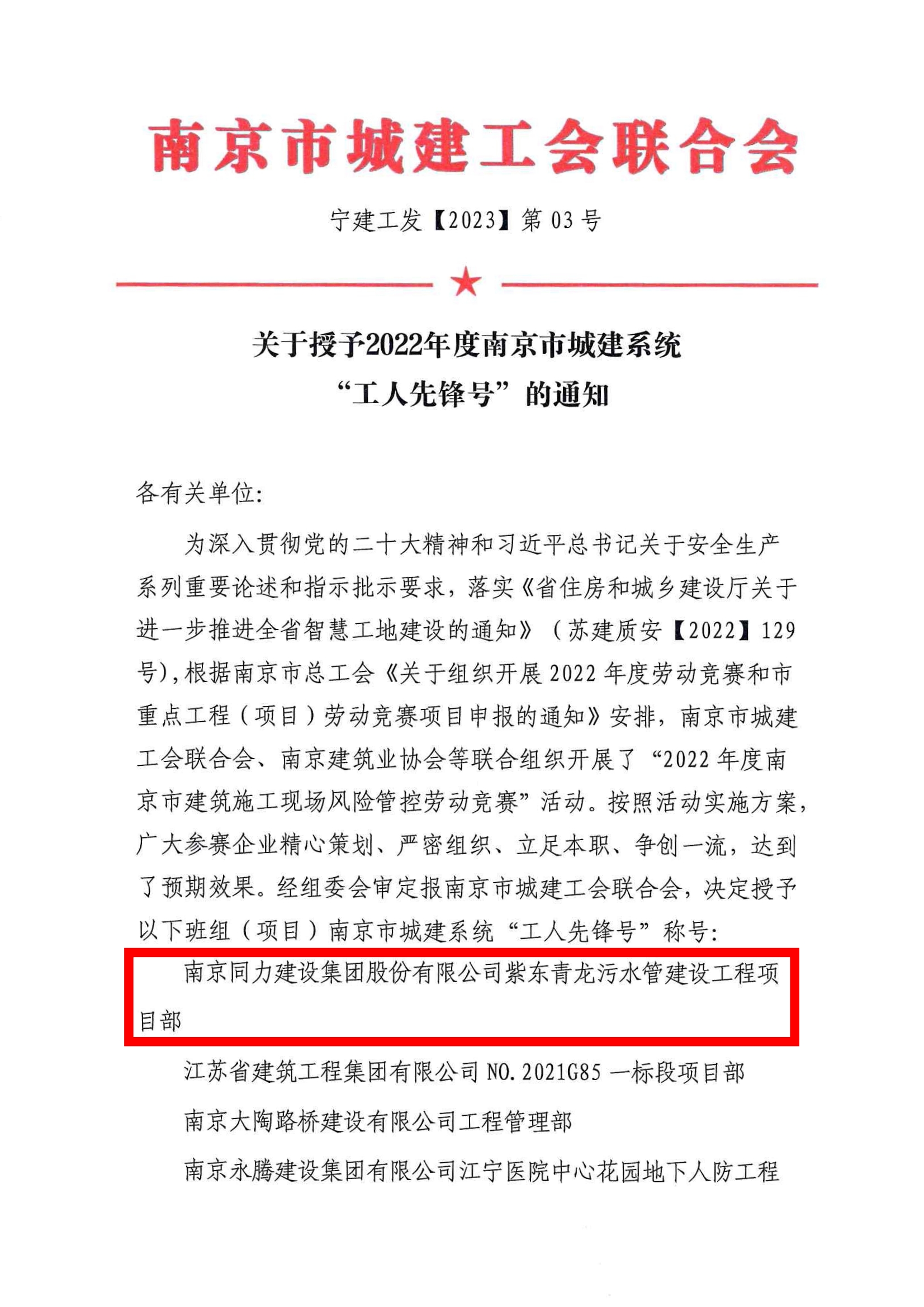 近日,南京市城建工会联合会下发宁建工发[2023]第03号文《关于授予2022年度南京市城建系统“工人先锋号”的通知》,其中时博官方网站紫东青龙污水管建设工程项目部获2022年度南京市城建系统“工人先锋号”称号,继该项目被评选为南京市智慧化工地、南京市差别化工地、南京市水务2021年市级文明工地后获得又一殊荣,提升了企业影响力。