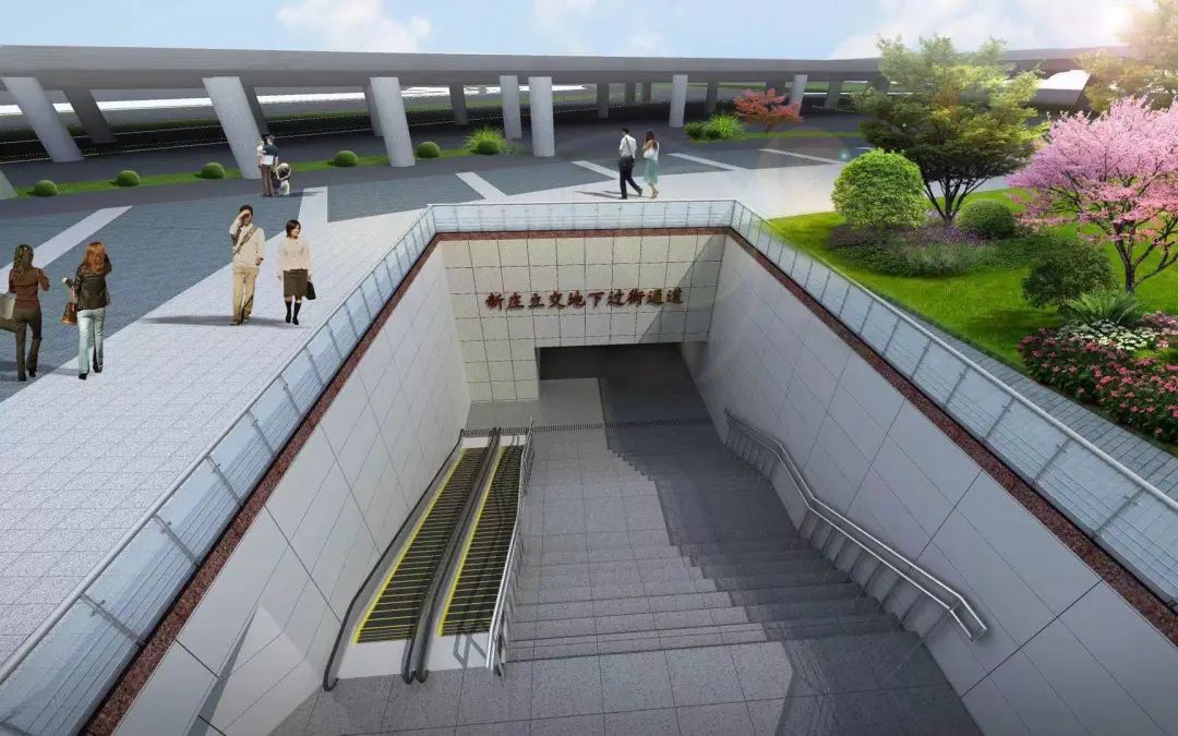 新庄立交地下过街通道由南京林业大学向西北方向布设,并在玄武大道下方呈“Y”形分叉,连接紫金联合立方、南京林业大学和高力六角广场。通道总长361.5m,三条主通道长 232.8m,此次贯通的是紫金联合立方至玄武大道段,全长110m。